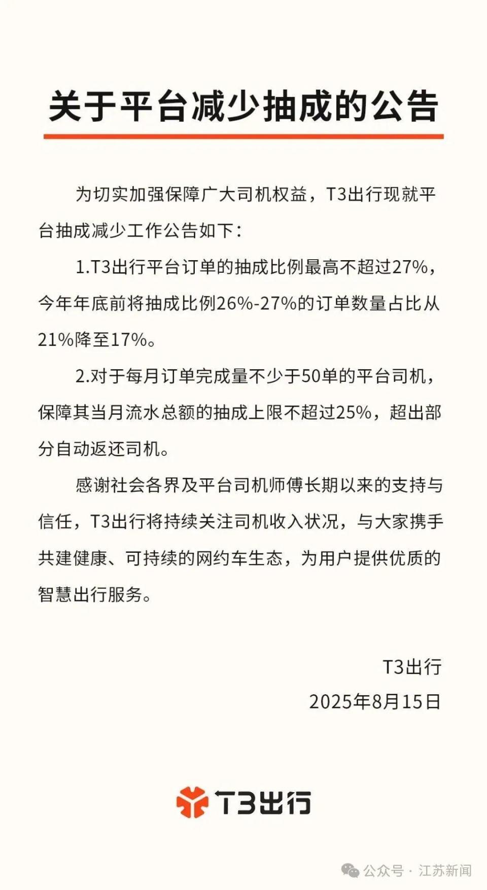 T3出行也发布减少抽成的公告,称平台抽成比例最高不超过27%,今年年底前,抽成比例26%-27%的订单数量占比将从21%降至17%。