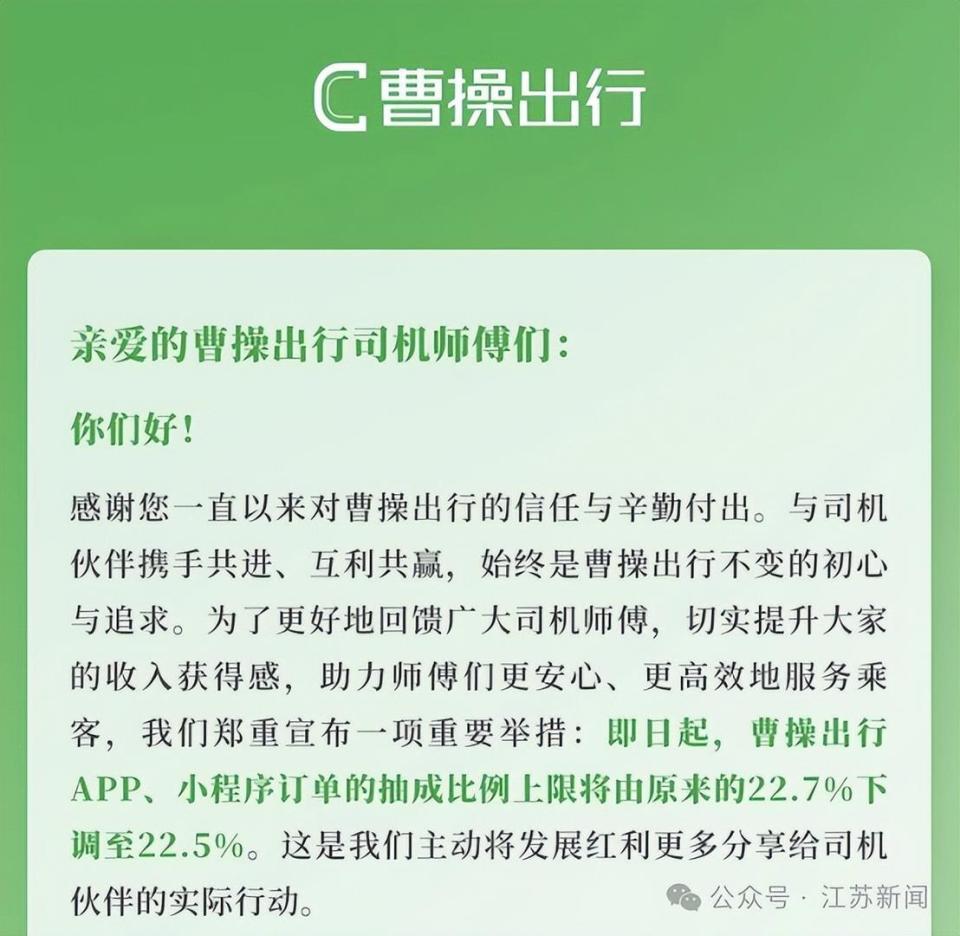 曹操出行则表示,将APP、小程序订单的抽成比例上限将由原来的22.7%下调至22.5%,“这是我们主动将发展红利更多分享给司机伙伴的实际行动”。